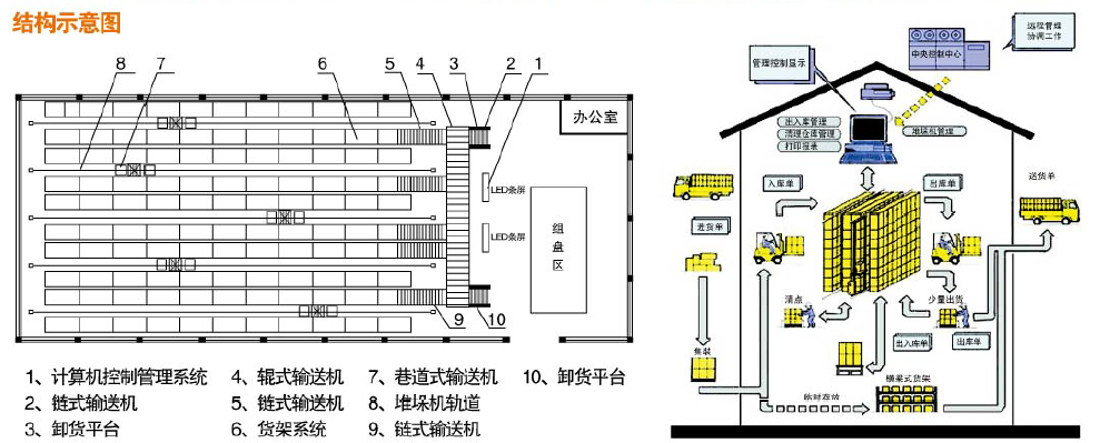 立體庫通常由貨架、巷道式堆垛起重機(jī)、入(出)庫工作平臺和自動運(yùn)進(jìn)(出)及操作控制系統(tǒng)組成。貨架安裝在建筑物或結(jié)構(gòu)體內(nèi),貨架內(nèi)是標(biāo)準(zhǔn)尺寸的貨位空間,巷道堆垛起重機(jī)穿行于貨架之間的巷道中,完成存、取貨的工作。管理上采用計算機(jī)及條形碼技術(shù)。
