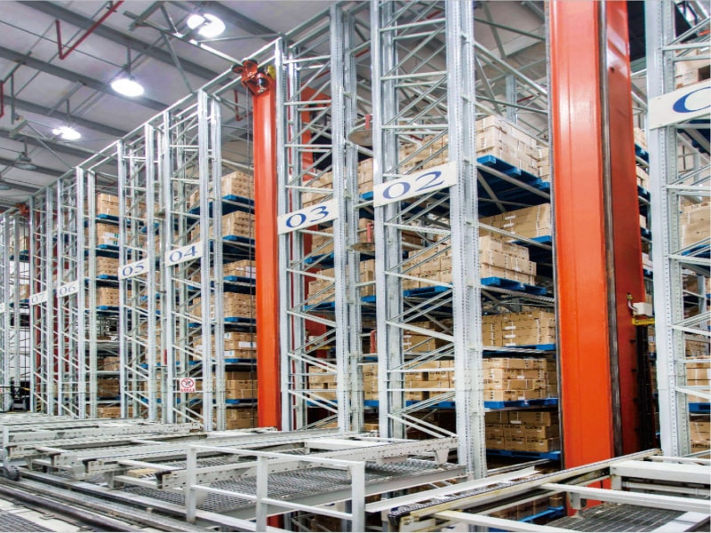 堆垛機(jī)是自動化立體庫的核心設(shè)備,典型的入出庫運(yùn)輸設(shè)備,是自動化立體倉庫特征標(biāo)志。其在貨架巷道間來回穿梭運(yùn)行。將位于巷道口的貨物送入貨格中,或?qū)⒇浉裰械呢浳锶〕鲞\(yùn)送至巷道口,與貨架系統(tǒng)、輸送機(jī)系統(tǒng)、穿梭車系統(tǒng)等庫用設(shè)備及WMS、WCS、現(xiàn)場測控系統(tǒng)組成自動化立體庫。通常由機(jī)架(上下橫梁、立柱)、水平行走及提升機(jī)構(gòu)、載貨臺、貨叉及電氣控制系統(tǒng)構(gòu)成。